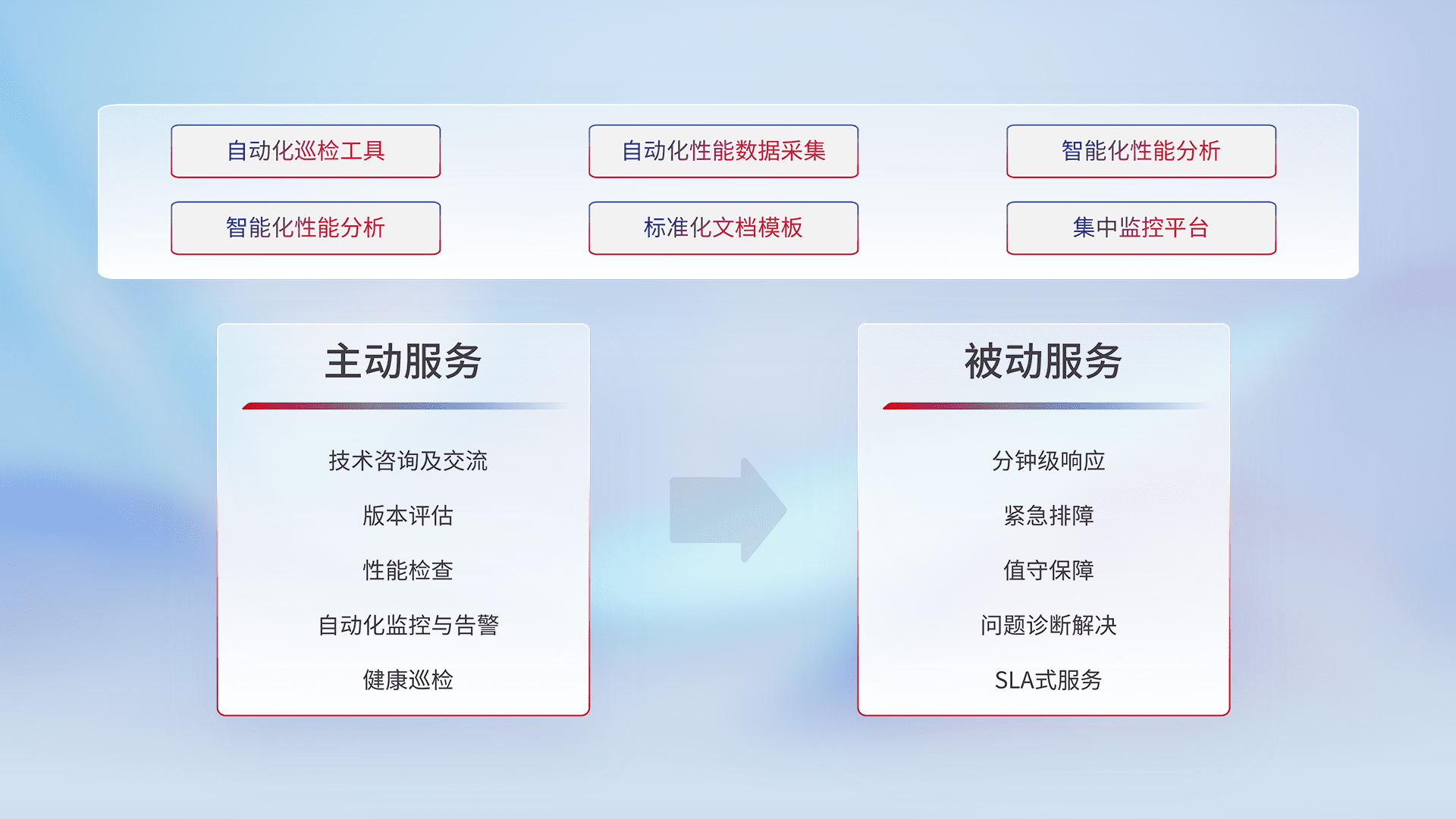 智能化工具和标准化文档,,,,保障服务质量,,,提供主动服务(包含技术咨询、、、、版本评估、、性能检查、、、自动化监控与告警、、、健康巡检)和被动服务包含(分钟级响应、、、紧急排障、、、、值守保障、、、问题诊断解决、、SLA服务)。。。。